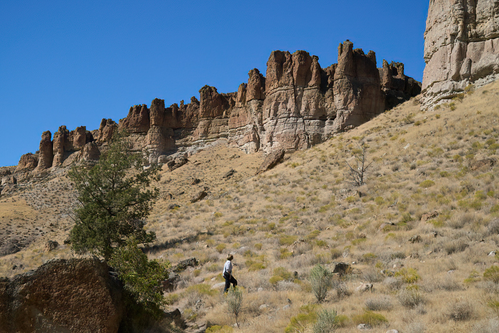 Jadis jungle préhistorique luxuriante, la région s’est transformée, au gré des éruptions volcaniques, en un haut désert parsemé de formations rocheuses imposantes et de collines multicolores.  La John Day River que nous suivons apporte une touche de couleurs supplémentaires avec sa végétation abondante et verdoyante. Elle nous permet aussi une rencontre inattendue.