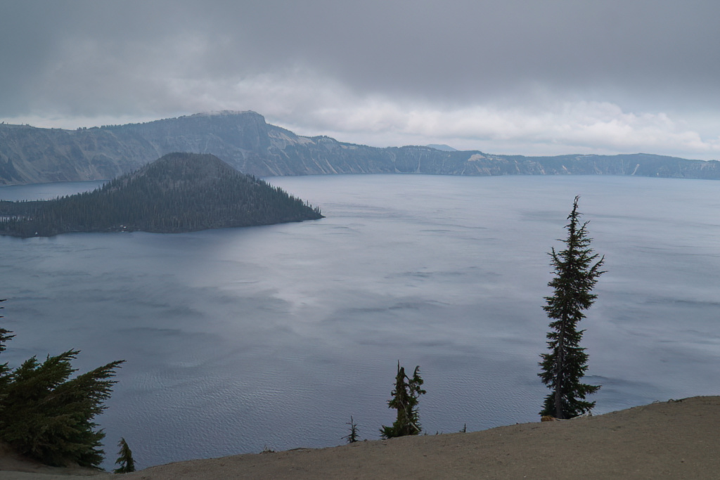Le premier point d’observation de la route qui en fait le tour sur une cinquantaine de kilomètres nous offre des vues splendides, malgré la grisaille. La surface du lac évoque le plomb fondu.