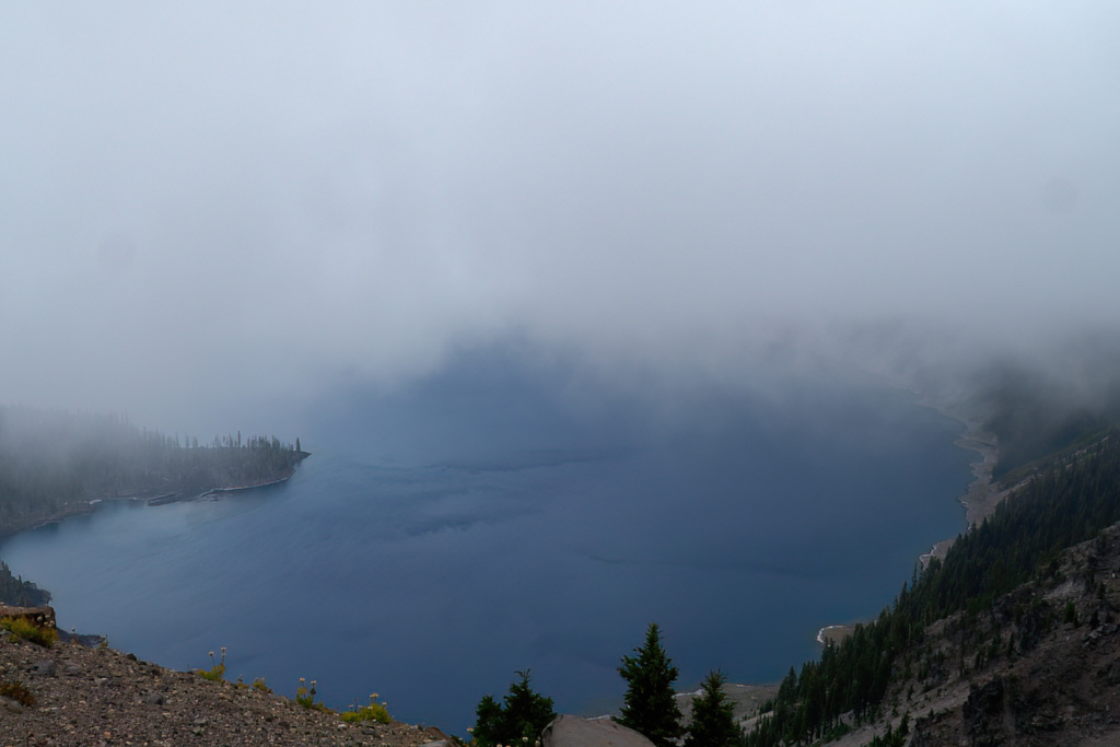 Ce matin, le soleil qui nous a très souvent accompagné dans notre voyage a disparu. Il a plu cette nuit et le ciel n’annonce rien de bon. Depuis la fenêtre , je vois, au loin, la forêt entourant Crater Lake plongée dans la brume. Même lui nous conseille de rester au chaud de notre maison.